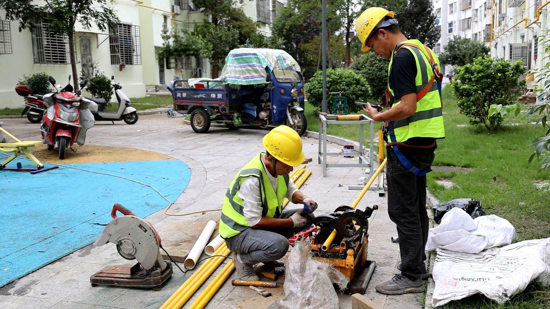 燃气管道老化更新改造是城市更新的重要内容,也是关乎居民生活品质和生命财产安全的民生大事。县城市更新行动指挥部将燃气管道老化更新改造与老旧小区改造、道路升级同步推进,全力解决居民“用气难、用气忧”问题。在幸福小区、和谐小区燃气管道加装现场,燃气施工人员正精准对接住户进行管道接驳,居民们聚在一起,脸上满是期待。