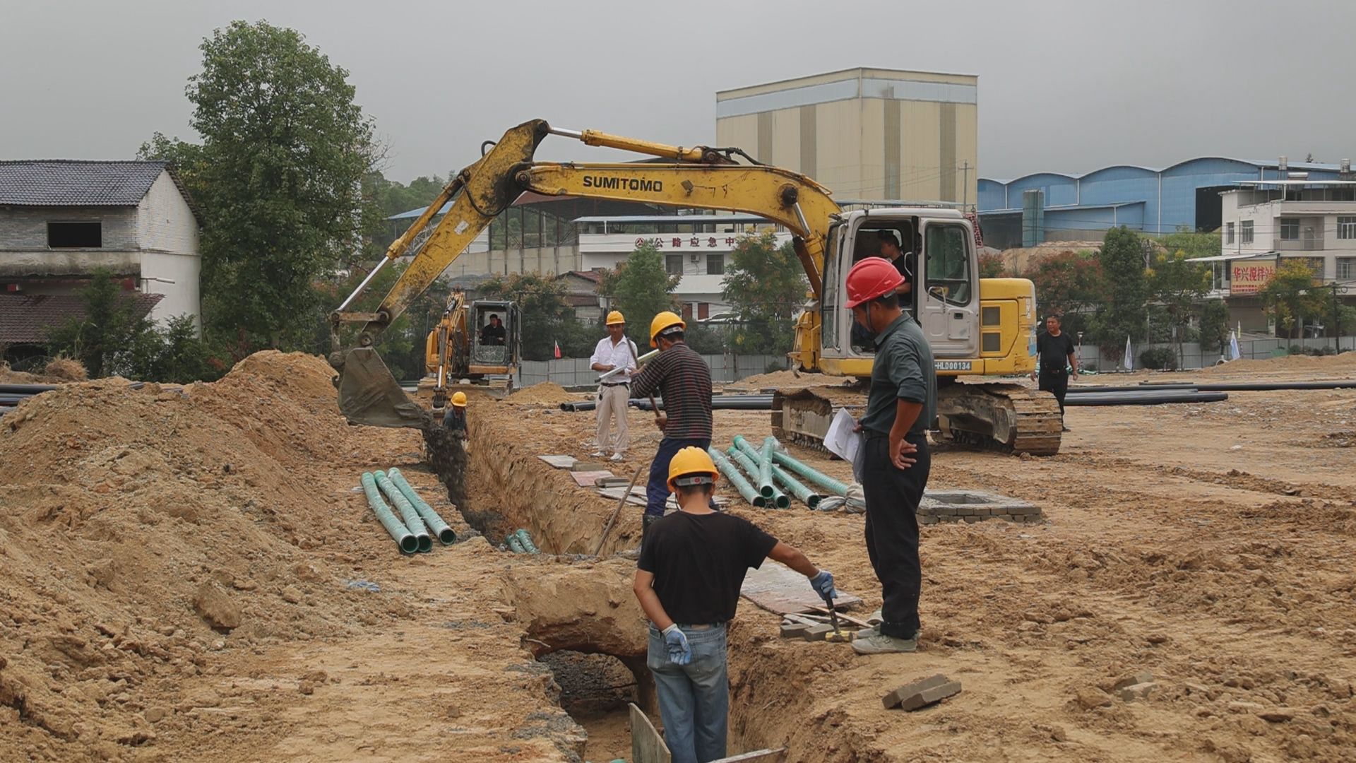10月7日,在通城(城东)智能云停车场建设项目现场,挖掘机挥舞长臂,施工人员有条不紊地在各自的岗位上忙碌,一派热火朝天的繁忙景象。