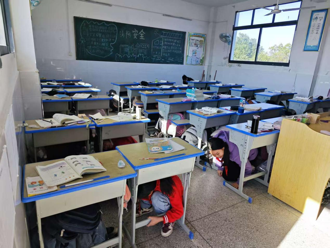 上午9时50分,防震应急演练信号准时响起。任课教师立即停止授课,迅速指导学生双手抱头、弯腰屈膝,躲在课桌下方,利用课桌遮挡头部和身体,避免被掉落物砸伤,整个避险过程紧张而有序。