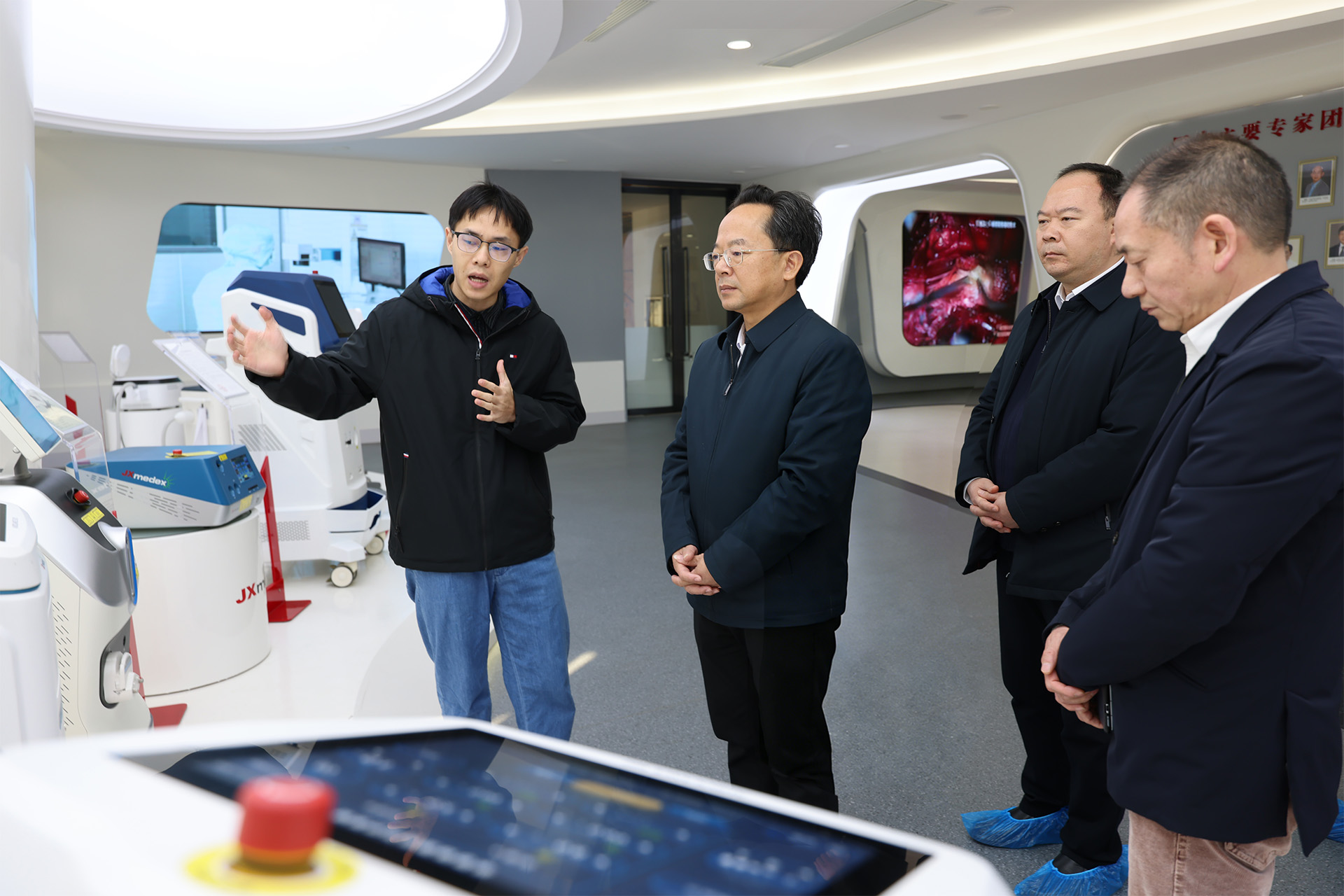 在江西考察期间,黄建平走进主营医疗器械研发生产的某科技有限公司,参观产品展示厅与生产车间,了解企业经营、产品应用、市场销售及发展规划,对企业深耕医疗器械细分领域、坚持科技创新驱动、积极开拓海外市场的做法给予高度评价。他指出,通城拥有丰富的全国性药商资源,已建成药姑山健康产业园,设立了相关产业发展基金,产业基础扎实、条件优越、潜力巨大。双方合作将会形成强大的产业集群效应,诚挚邀请企业组团到通城实地考察,亲身感受通城的产业生态、营商环境,共同推动项目落地生根。