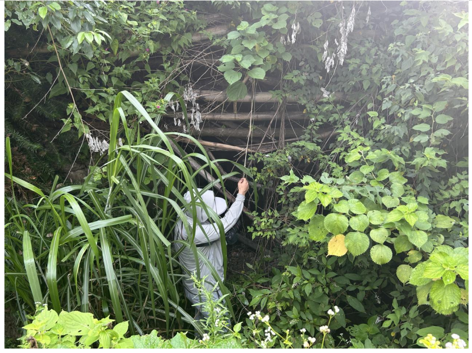 7月23日,普查队员黄宏杰同志不惧40多度的高温与蛇虫,毅然进入杂草丛生的深坑中寻找文物点