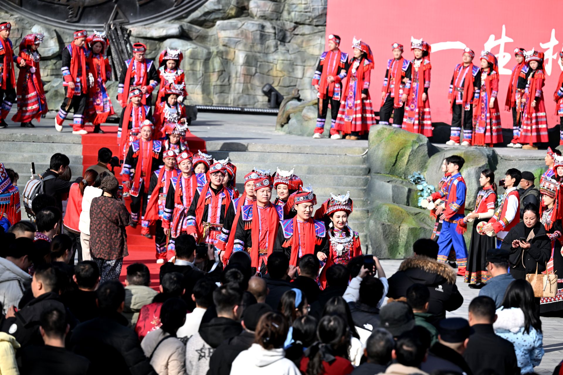 游戏落幕,收获的不仅是兑换而来的演出门票与纪念礼品,更是情感的悄然升温。而这场沉浸式的文化体验,也仅仅是当天婚典的序曲。随后,所有人的目光与脚步,一同聚焦于那场庄严而热烈的瑶族传统婚礼仪式。