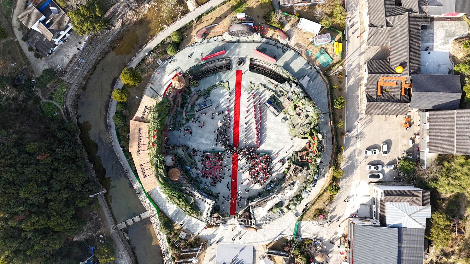 在古瑶村下广场,一条精心设计的路线串联起六个打卡点。新人们需通过诗词接龙启动挑战,随后携手闯过“一箭倾心”投壶、“猜词传情”默契考验、“执手碰杯”协作、“山歌传唱”接龙、“七星祈愿”套圈和“色彩共鸣”转盘等六重关卡。每一关都融入了中华传统雅趣与瑶族特色,更在趣味中考验着新人的默契与同心。