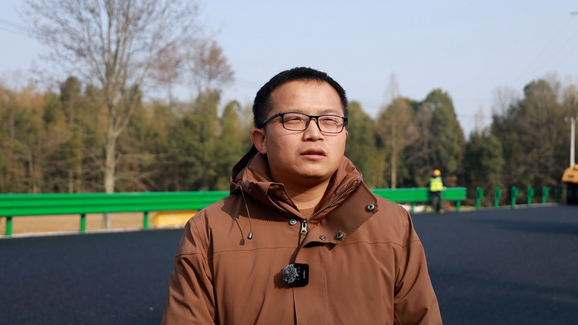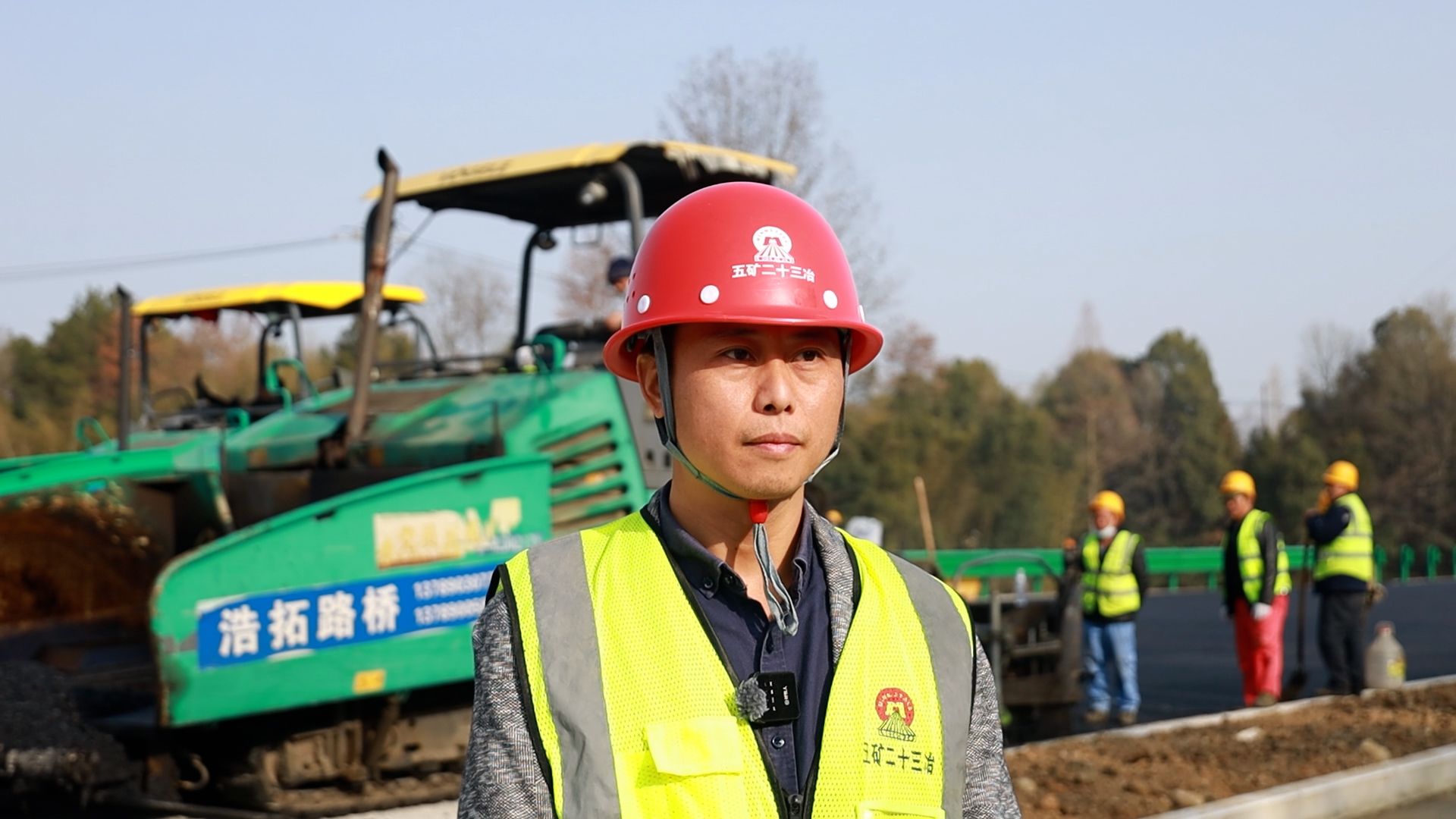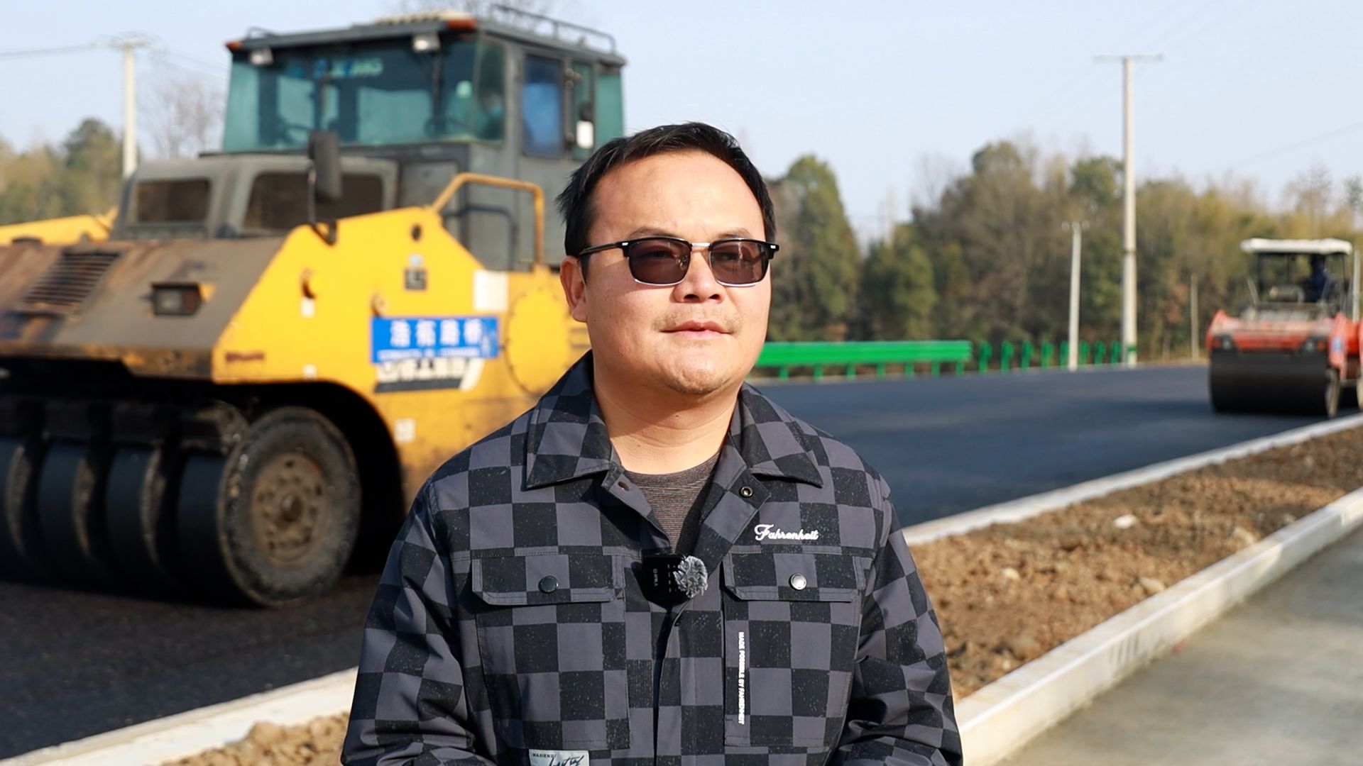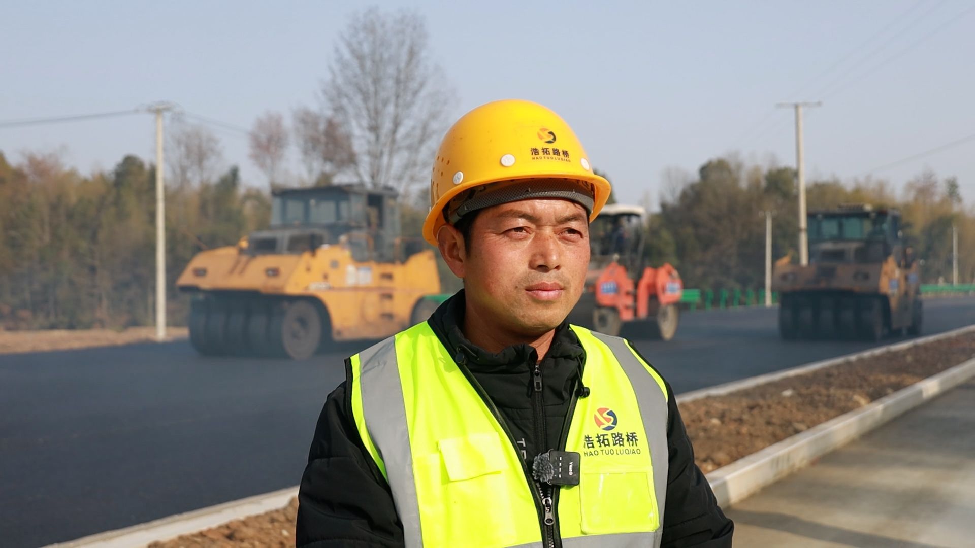 施工现场沥青摊铺工人 李志义:看着这条路一天一个样,心里挺自豪的。虽然春节可能没法早点回家,但能用我们铺好的路,给通城老百姓拜年,感觉这个年过得特别有意义,值了!