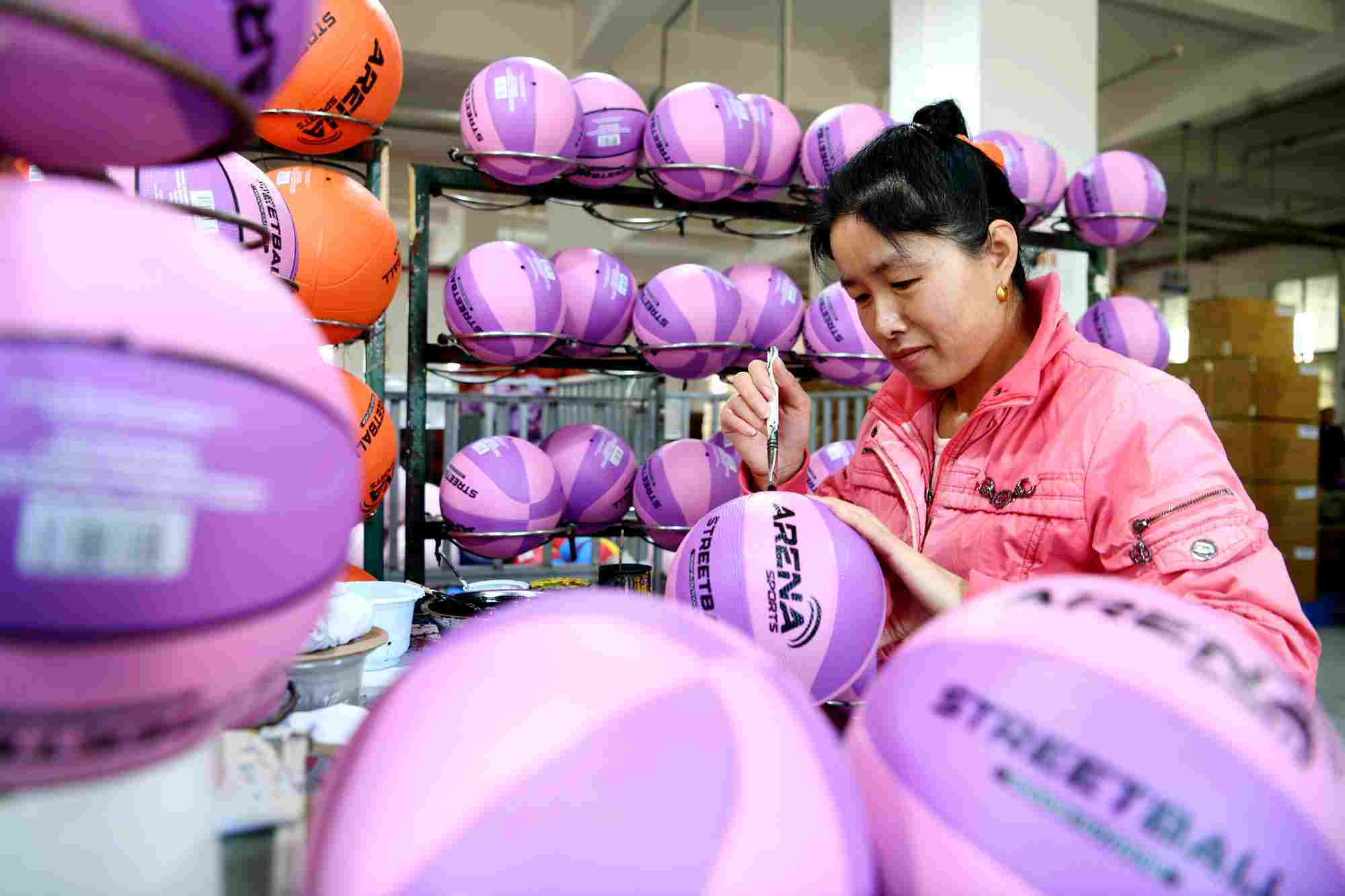 通城辉隆体育用品有限公司的员工在生产、质检、包装各种球类产品,抢时争速,赶制订单。