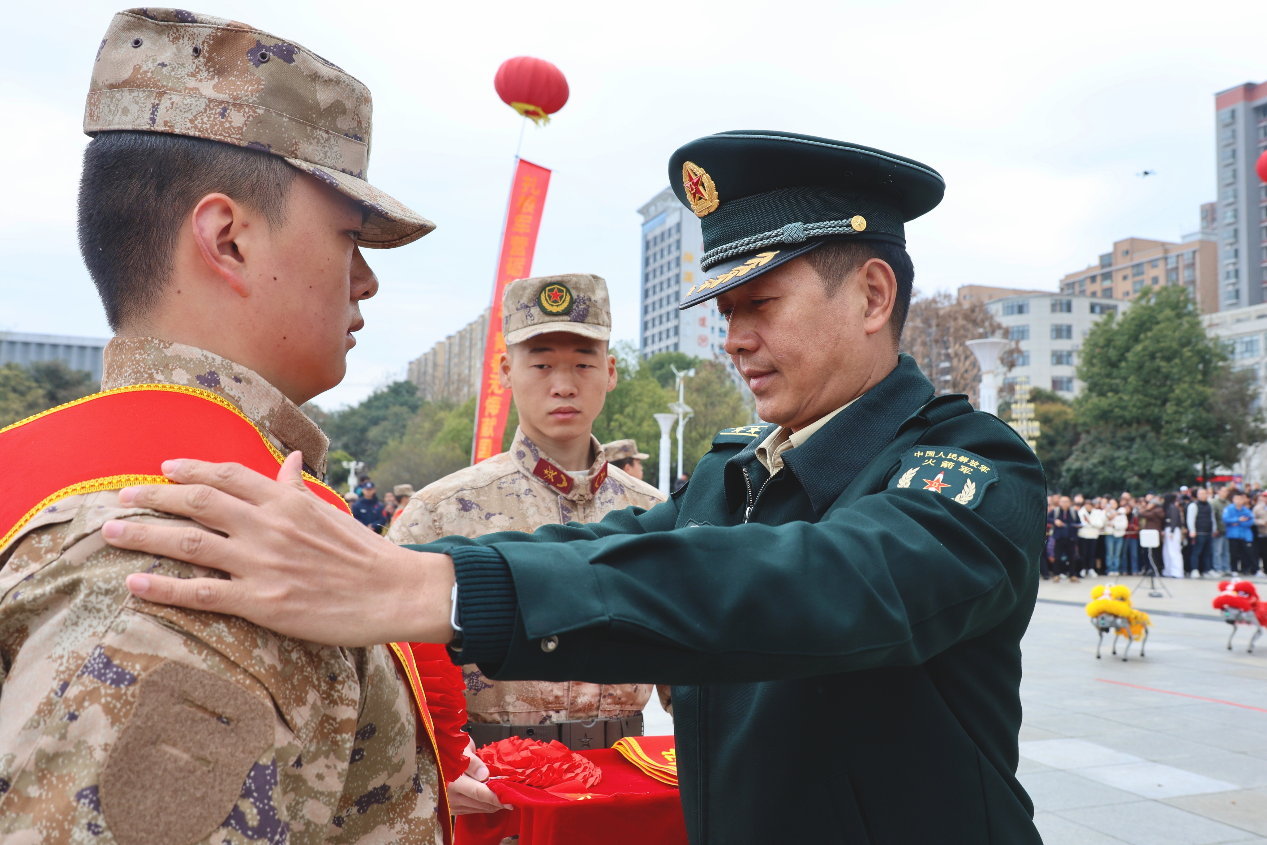 在热烈庄重的氛围中,县领导来到新兵方阵前,逐一为新兵佩戴 “光荣入伍” 绶带和大红花。县二中学生代表向新兵们献花致敬。新兵代表王文康作表态发言,全体新兵面向军旗庄严宣誓,以铿锵誓言表达对党和人民的绝对忠诚。