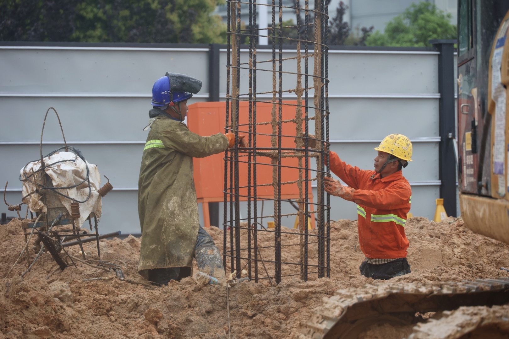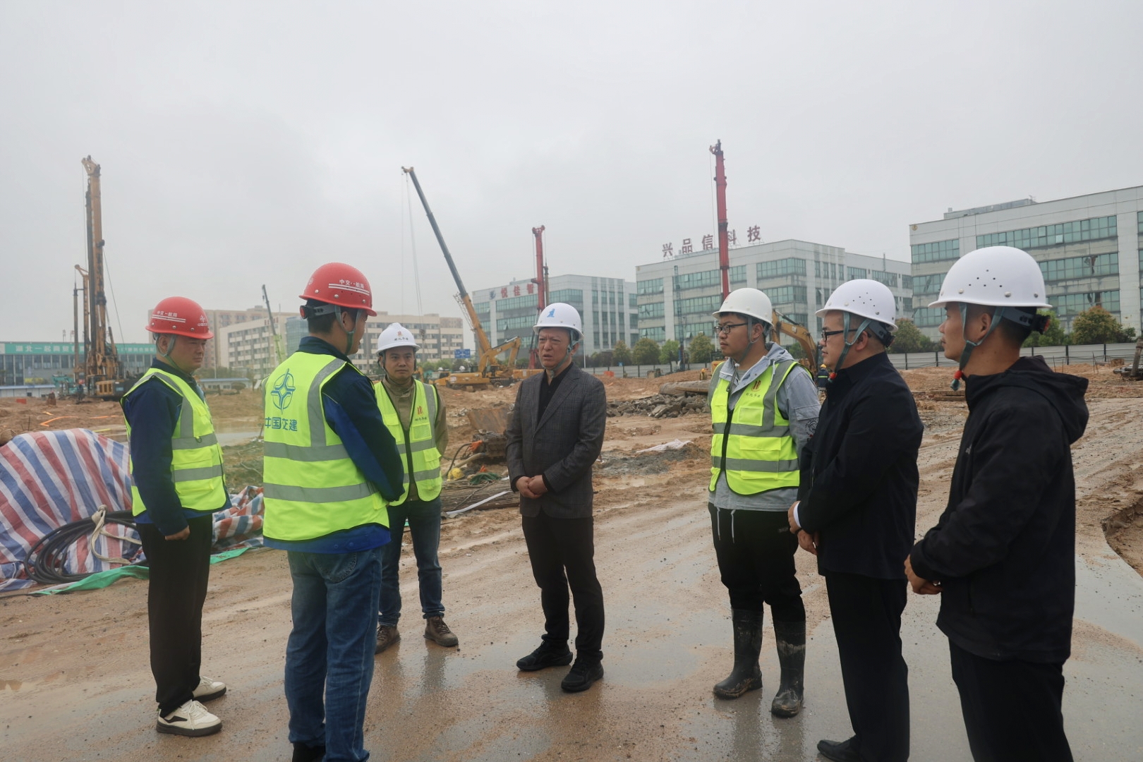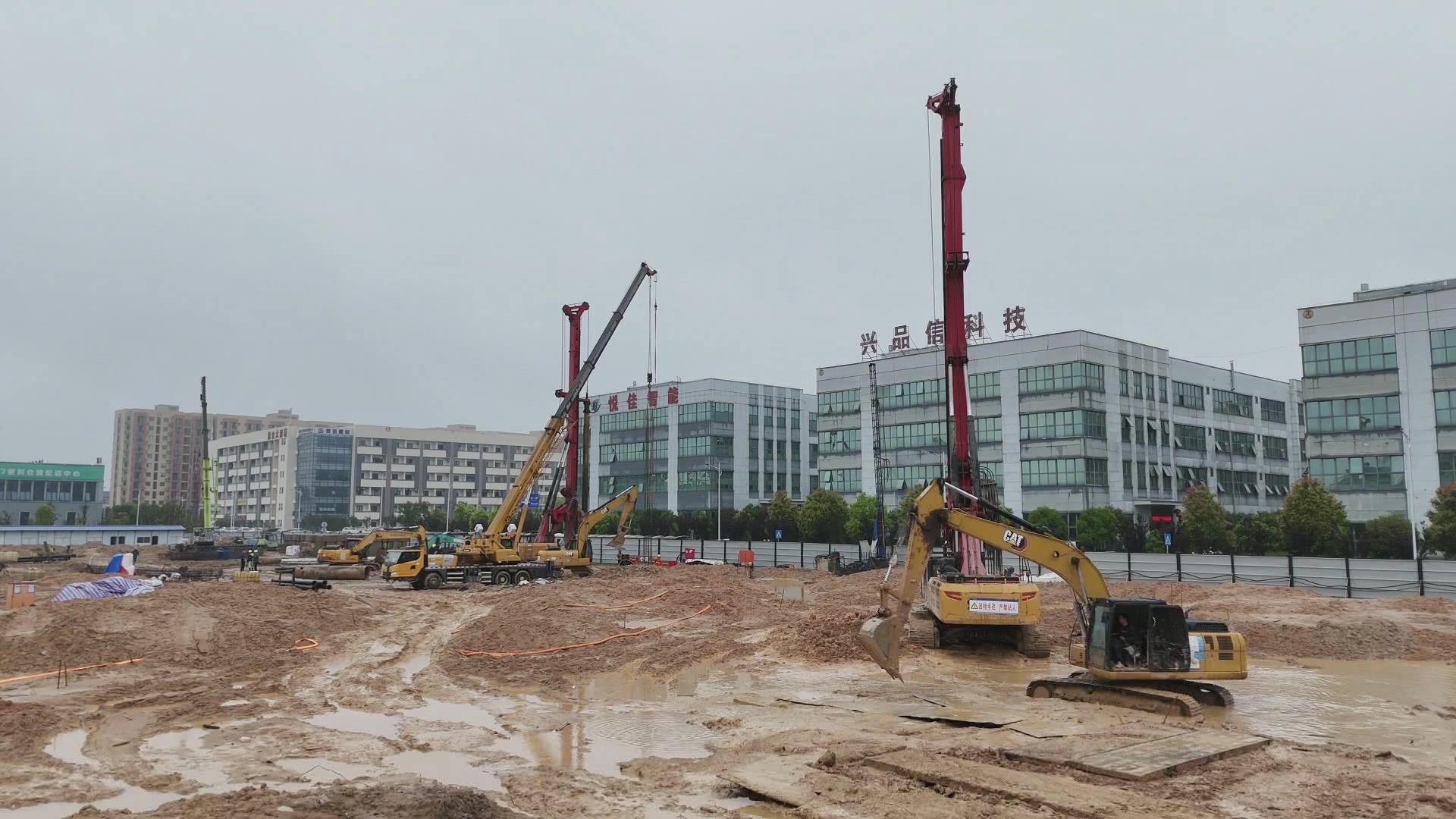 在项目建设现场,机械轰鸣、车辆穿梭,一派热火朝天的景象。头戴安全帽的工人们分工有序,加紧进行园区内桩基施工,多台机械设备同步作业,大型挖掘机、推土机、渣土车协同作战,平整场地,现场忙而不乱。