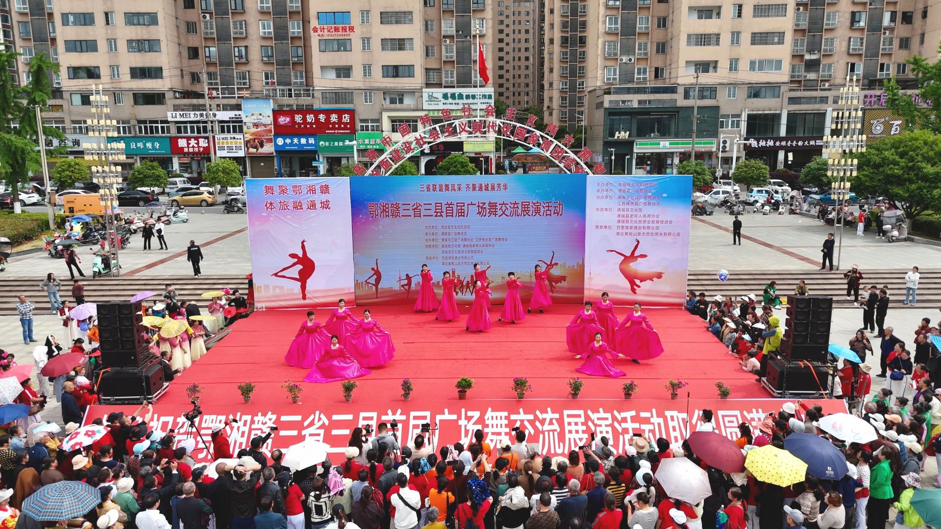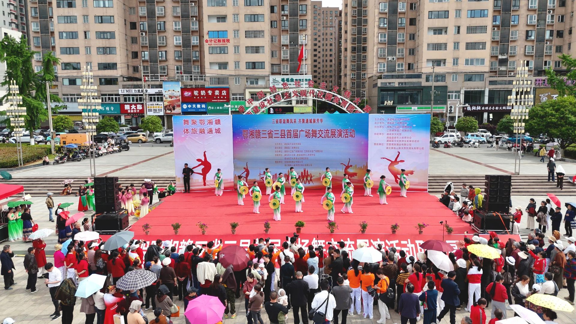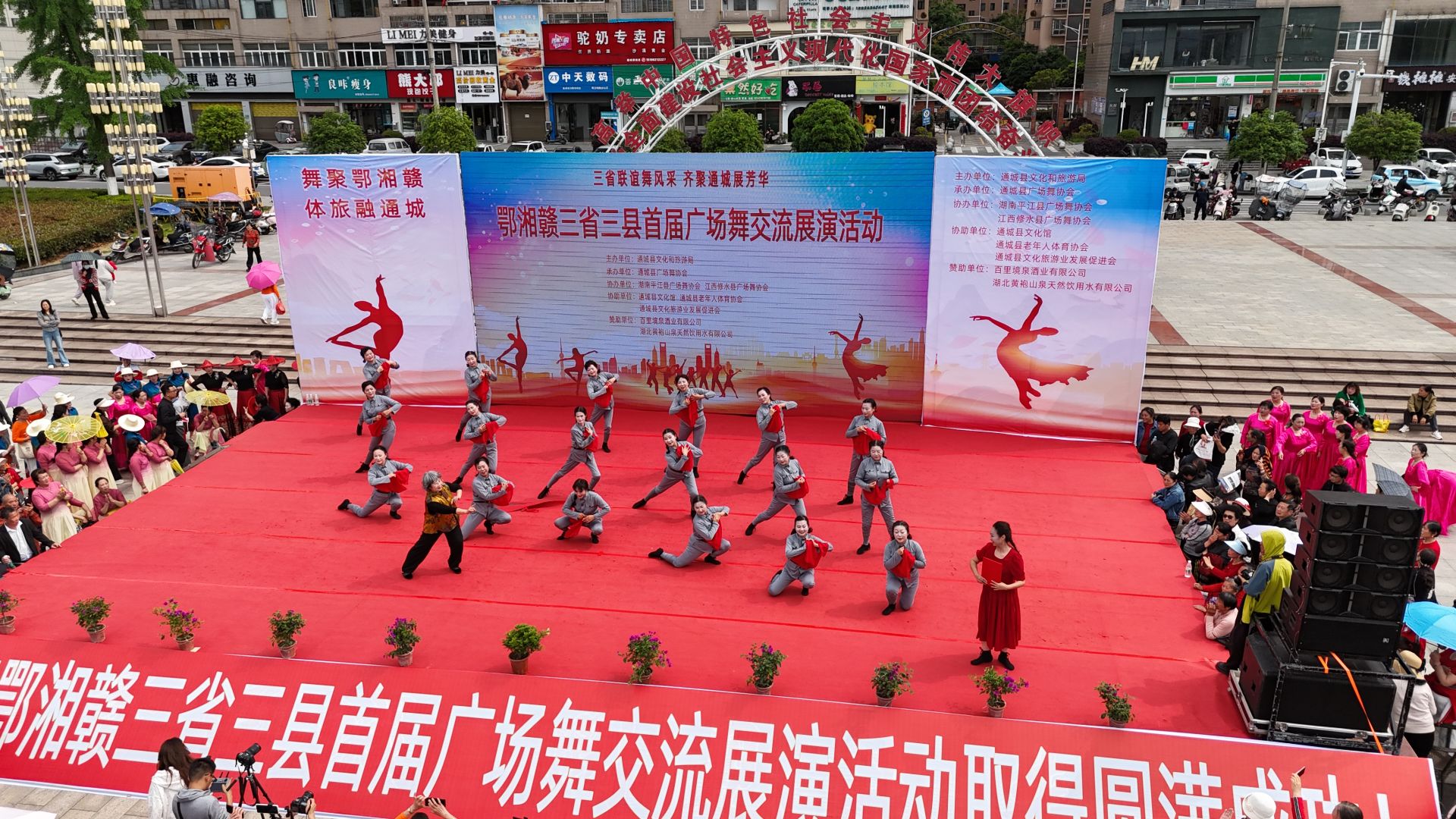 【全媒体记者 刘祥宇】作为2026年鄂湘赣毗邻地区“非遗+潮玩”嘉年华暨文旅融合促消费活动的重要配套文体活动,鄂湘赣毗邻地区广场舞展演活动在我县银山广场盛大启幕。来自湖北通城、湖南平江、江西修水的16支队伍、近600名舞者同台竞技,以舞为媒、以艺会友,用群众喜闻乐见的形式,为这场跨省域文旅盛会注入了浓厚的群众文化活力。
