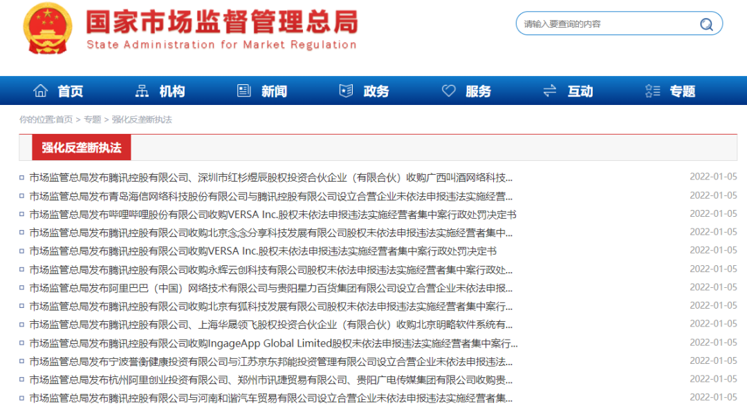 今天(1月5日),国家市场监督管理总局网站公布一批共13个行政处罚案件,包括腾讯、哔哩哔哩、阿里巴巴等企业。据悉,每个案件处罚金额均为50万元。