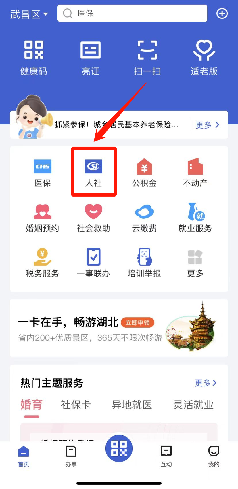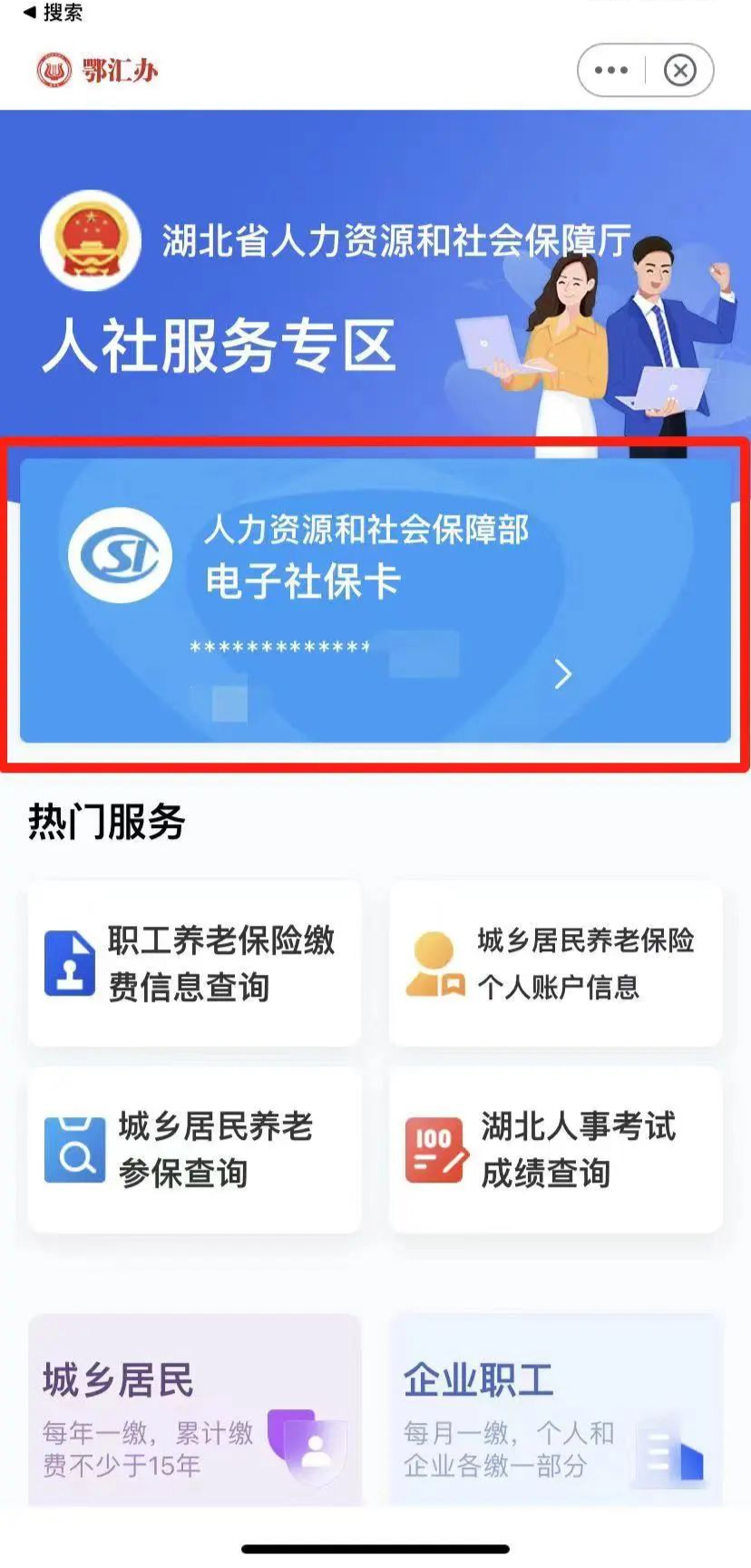 2、选择首页服务专区-【人社专区】,点击领取【电子社保卡】,并点击进入;