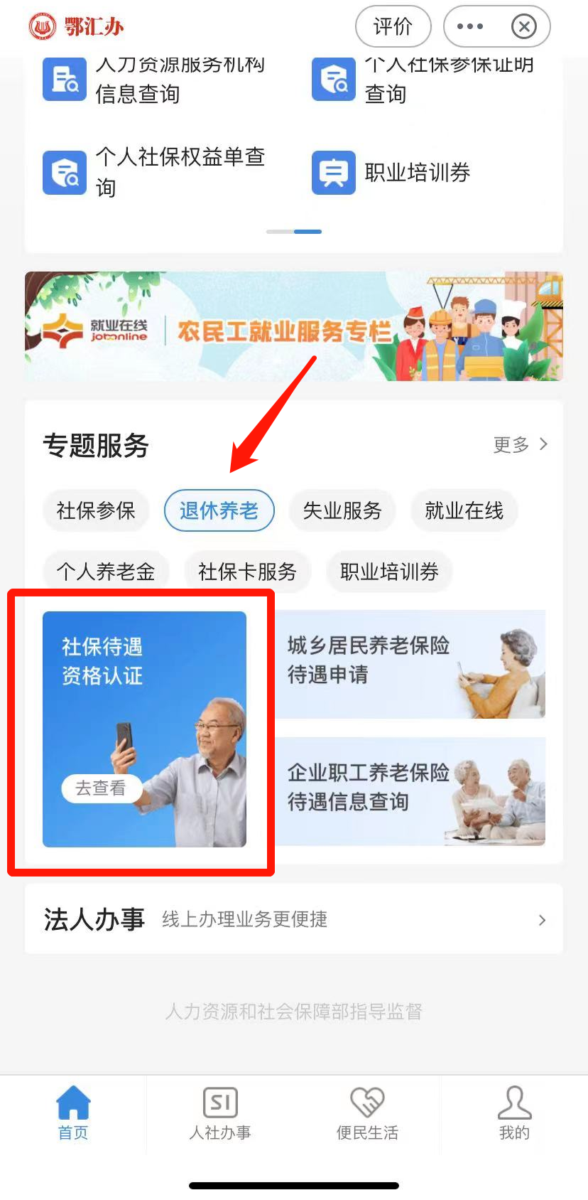 3、下拉滑动,找到【专题服务】-【退休养老】,点击【社保待遇资格认证】。