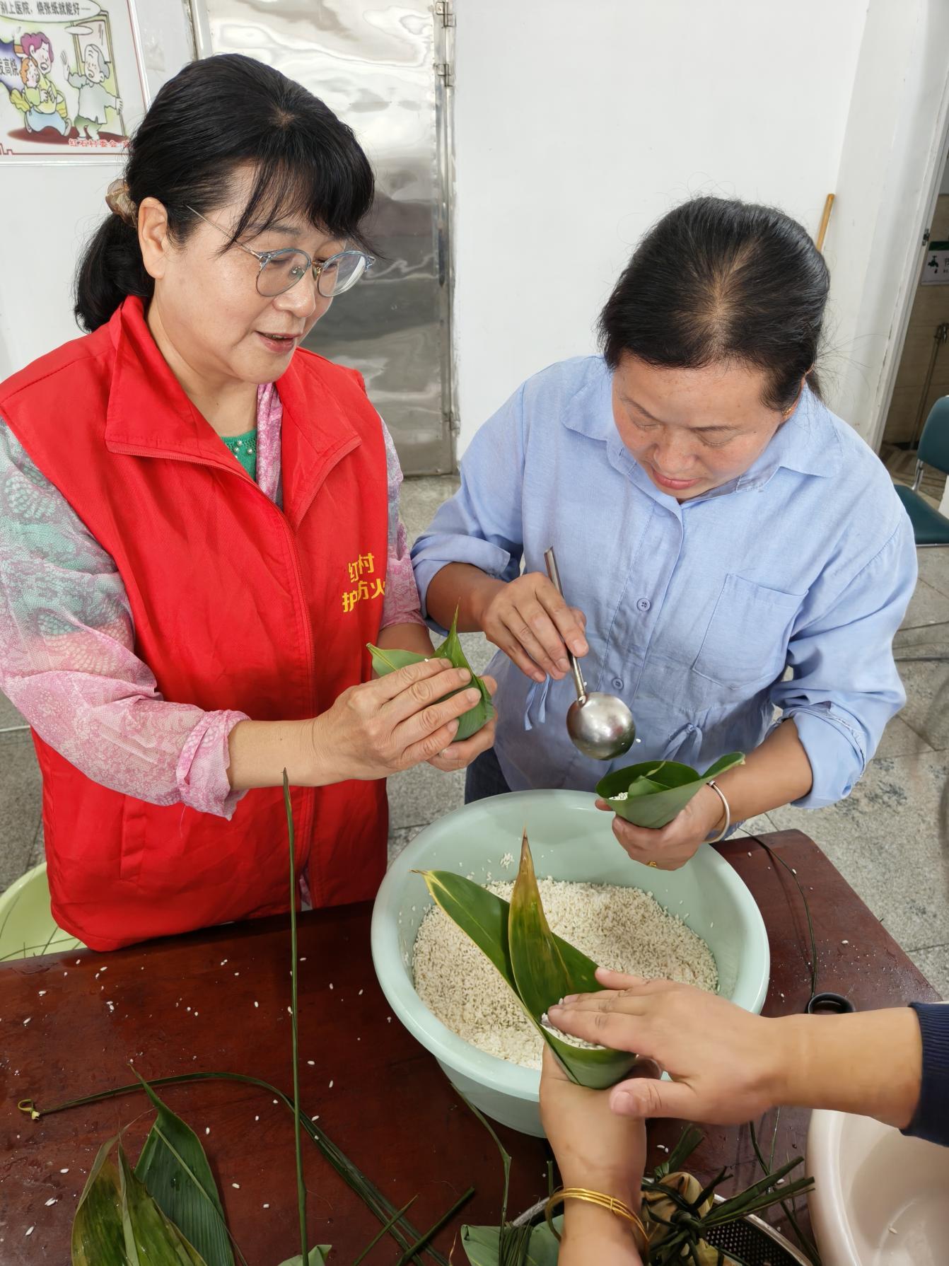 活动现场热闹非凡,大家纷纷拿出看家本领,只见粽叶在村民们的巧手下迅速折叠成漏斗状,紧接着填入精心准备的糯米、红枣等馅料,再用粽叶紧紧包裹,最后熟练地用细绳捆扎。不一会儿,形态各异、饱满诱人的粽子便摆满了桌面。包粽子过程中,大家相互交流技巧、分享经验,欢声笑语此起彼伏,邻里情谊在指尖的粽叶间传递升温。